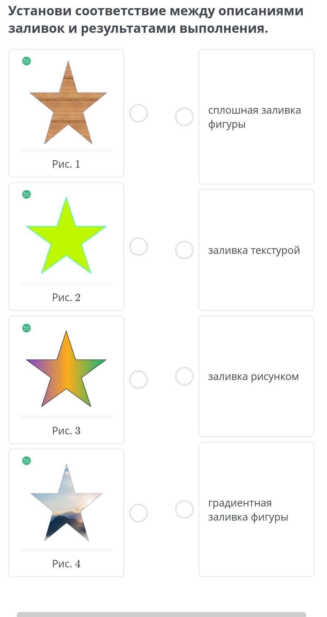 Установи соответствие между описаниями заливок и результатами выполнения.