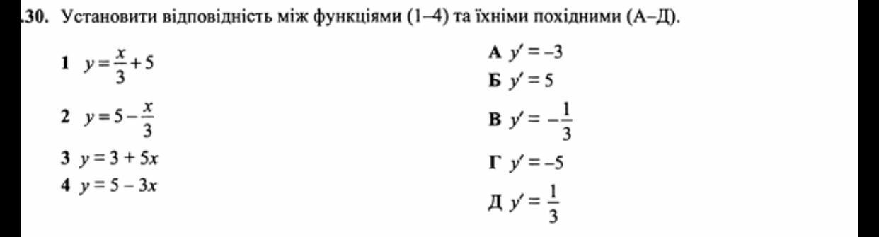 1)от числа 5 производная равна =0 x/3 можно расписать как 1/3×x, где производная коэффициента равна =0=> ответ 1/3