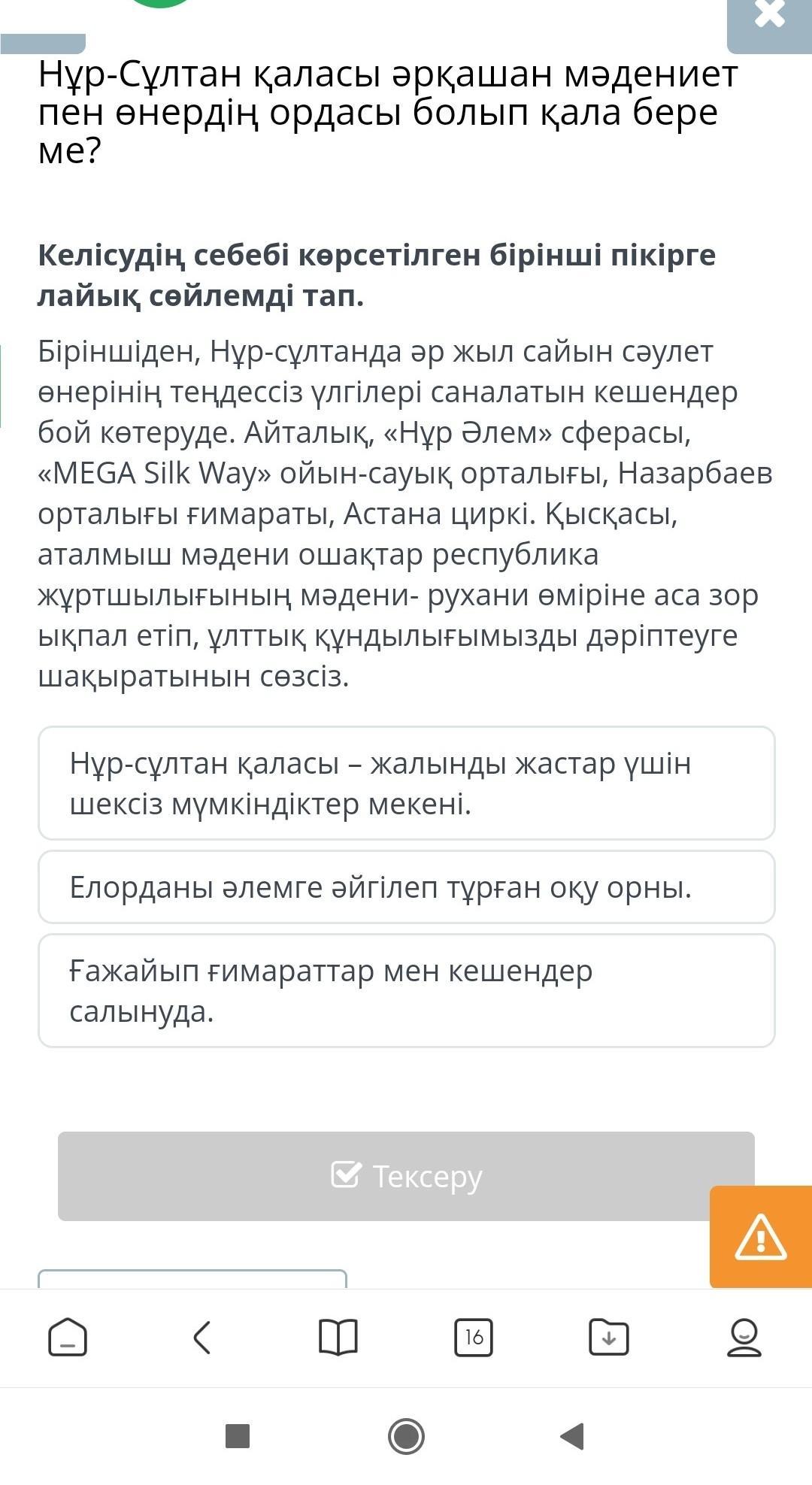 Біріншіден, Нұр-сұлтанда әр жыл сайын сәулет өнерінің теңдессіз үлгілері саналатын кешендер бой көтеруде. Айталық, «Нұр Әлем» сферасы, «MEGA Silk Way» ойын-сауық орталығы, Назарбаев орталығы ғимараты, Астана циркі. Қысқасы, аталмыш мәдени ошақтар республика жұртшылығының мәдени- рухани өміріне аса зор ықпал етіп, ұлттық құндылығымызды дәріптеуге шақыратынын сөзсіз.