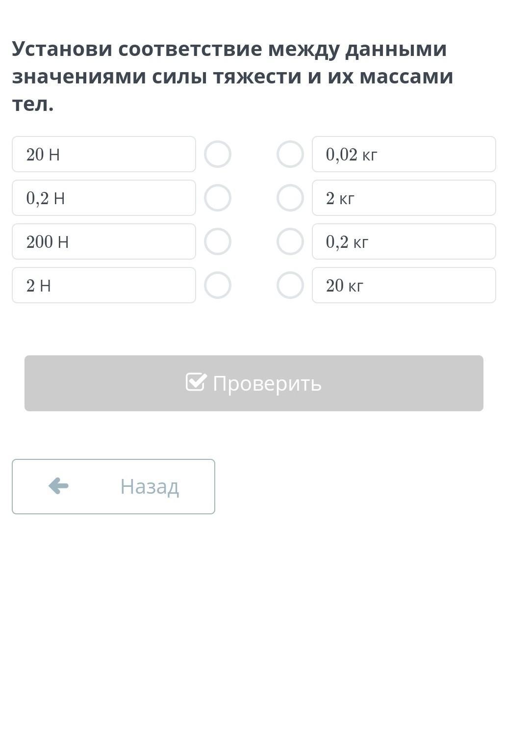 Установи соответствие между данными значениями силы тяжести и их массами тел.