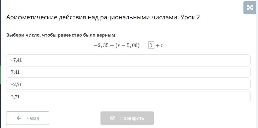 Выбери число, чтобы равенство было верным. –7,41 7,41 –2,71 2,71