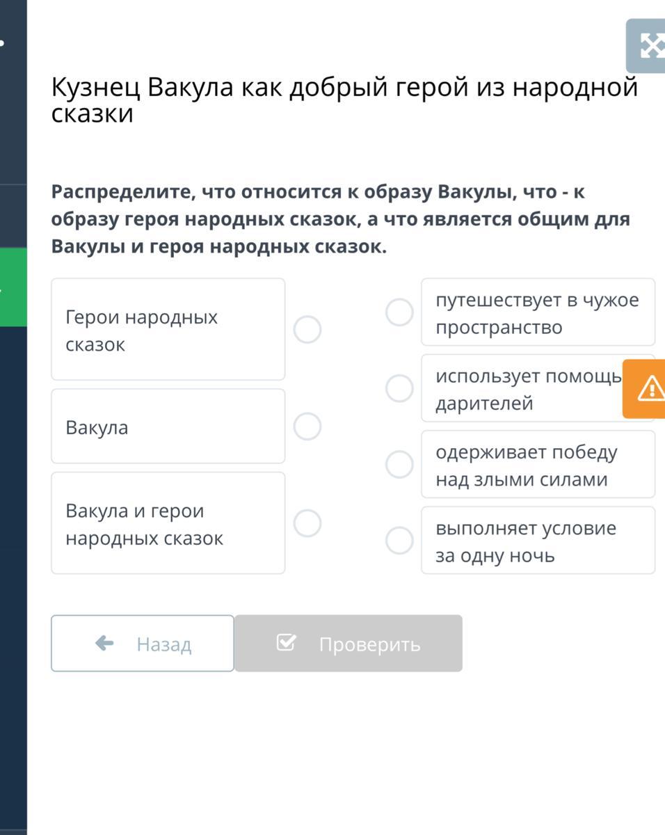 Распределите, что относится к образу Вакулы, что - к образу героя народных сказок, а что является общим для Вакулы и героя народных сказок.