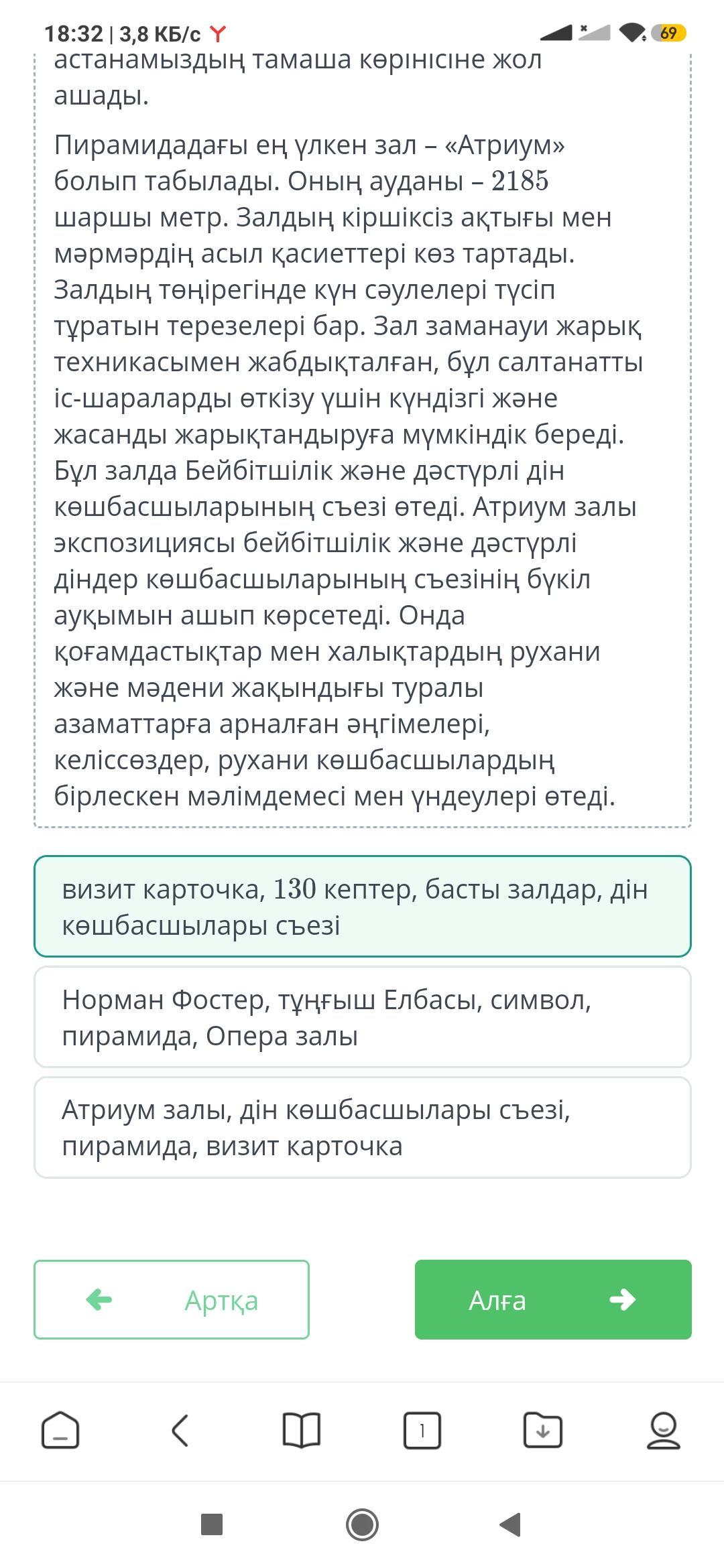 Бейбітшілік және келісім сарайы Мәтіндегі басты тірек сөздерді тап. Бейбітшілік пен келісім сарайы Бейбітшілік пен келісім сарайы Тәуелсiздiк даңғылы бойында орналасқан. Ол 2006 жылы ашылды. Жобаның авторы – әлемдегі көптеген керемет нысандарды жасаған, әлемге әйгілі британдық сәулетші Норман Фостер. Бейбітшілік және Келісім сарайы Нұр-Сұлтан қаласының негізгі визит карточкаларының бірі болып табылады және қазақстандықтардың бірлігін айшықтайтын нағыз символына айналды. Оның құрылыс идеясы ҚР тұңғыш Елбасы Нұрсұлтан Әбішұлы Назарбаевқа тиесілі, ол осы нысанды «Бейбітшілік және дәстүрлі дін көшбасшыларының съезін» өткізу үшін арнайы салу туралы ұсыныс жасады. Бейбітшілік және Келісім сарайы ұлылық пен әсемдікті біріктіреді. Бұл әлемдегі жалғыз пирамида тәріздес ғимарат – әлемнің тағы бір кереметі деп саналады. Өзінің ерекше пішініне сәйкес ғимаратты Пирамида деп те атайды. Пирамиданың төбесі, яғни күмбезінде – Қазақстан халқының бейнесі ретінде 130 кептер бейнеленген, олардың саны Қазақстанда тұратын түрлі ұлт өкілдерінің санына тең. Бейбітшілік және Келісім сарайының басты залдары: 1-қабатта – көрме алаңы, сондай-ақ Пирамиданың мақтанышы – Опера залы, 3-қабатта ең үлкен Атриум залында Бейбітшілік және келісім мұражайы бар, 8-қабатында кіші мәжіліс залы орналасқан. Пирамидадағы «Бесік» біздің жас астанамыздың тамаша көрінісіне жол ашады. Пирамидадағы ең үлкен зал – «Атриум» болып табылады. Оның ауданы – 2185 шаршы метр. Залдың кіршіксіз ақтығы мен мәрмәрдің асыл қасиеттері көз тартады. Залдың төңірегінде күн сәулелері түсіп тұратын терезелері бар. Зал заманауи жарық техникасымен жабдықталған, бұл салтанатты іс-шараларды өткізу үшін күндізгі және жасанды жарықтандыруға мүмкіндік береді. Бұл залда Бейбітшілік және дәстүрлі дін көшбасшыларының съезі өтеді. Атриум залы экспозициясы бейбітшілік және дәстүрлі діндер көшбасшыларының съезінің бүкіл ауқымын ашып көрсетеді. Онда қоғамдастықтар мен халықтардың рухани және мәдени жақындығы туралы азаматтарға арналған әңгімелері, келіссөздер, рухани көшбасшылардың бірлескен мәлімдемесі мен үндеулері өтеді.
