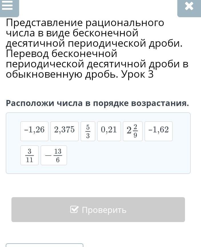 -1,62 ; -1,26 ; -13/6 ; 5/3 ;3/11 ; 0,21 ; 2 целых 2/9 ; 2,375