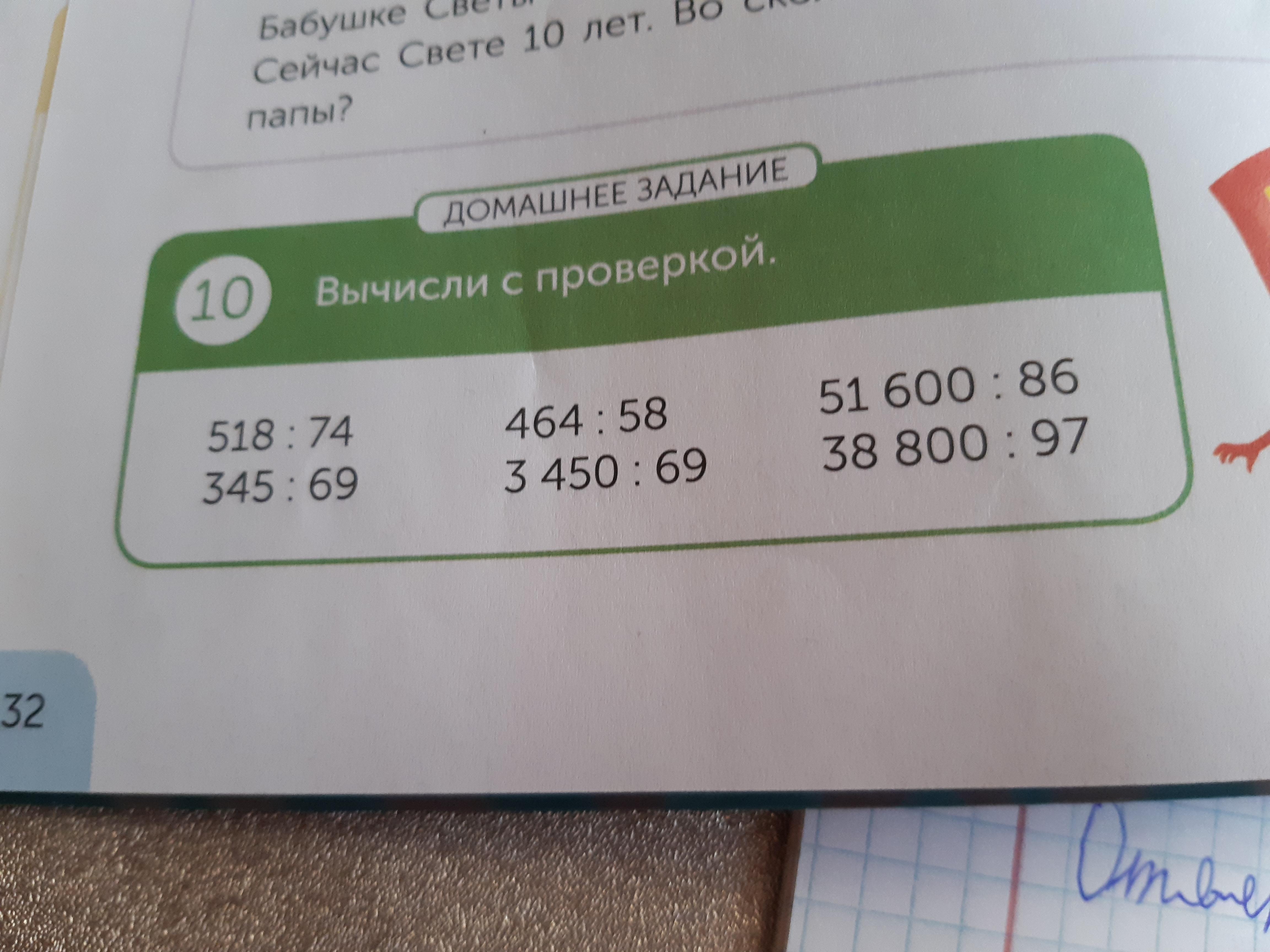 Ответ: 518 : 74 = 7 Проверка: 7 × 74 = 518 5 × 69 = 345 8 × 58 = 464