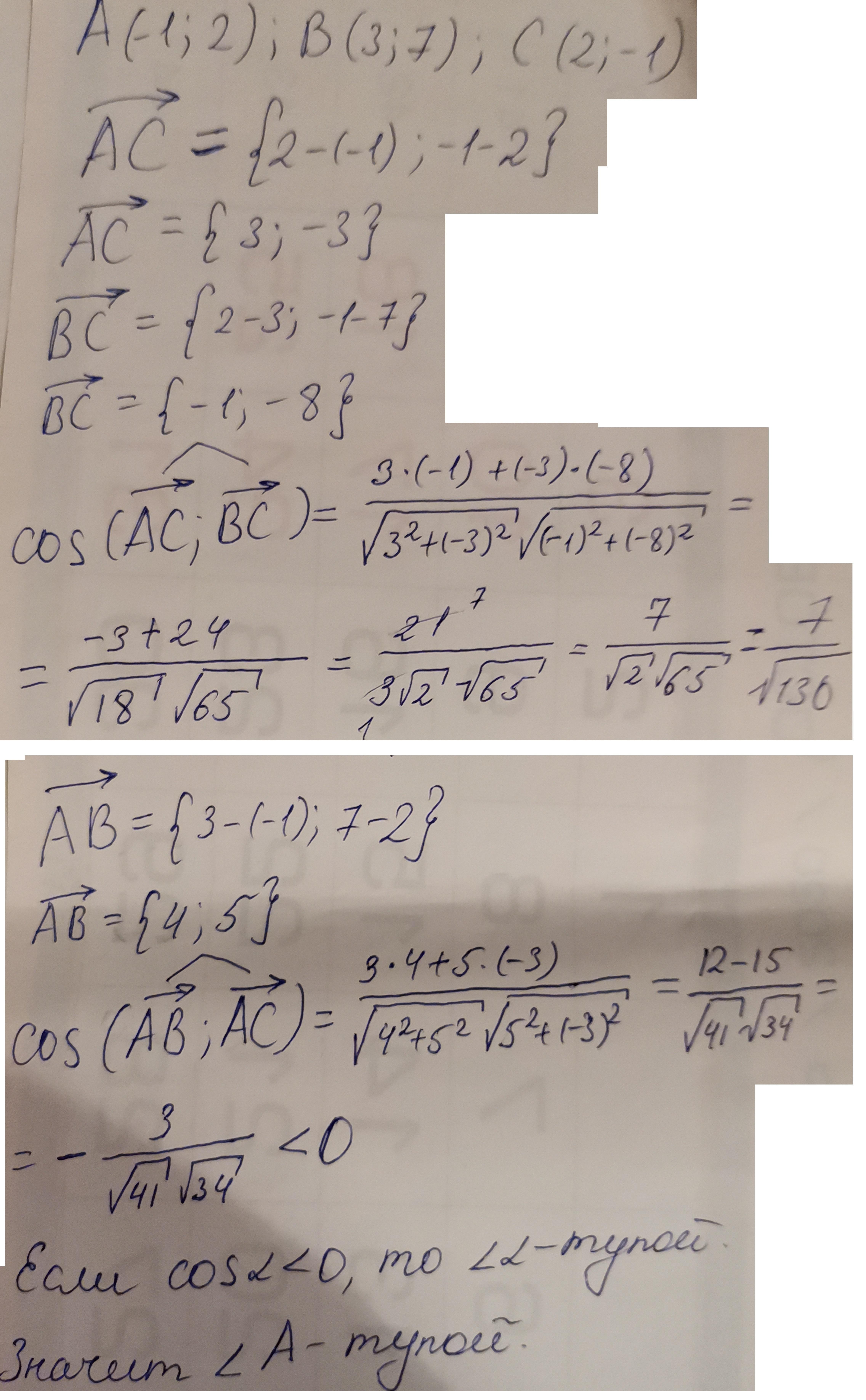 визначте вид трикутника, якщо А(-1,2), В(3,7), С(2,-1)
