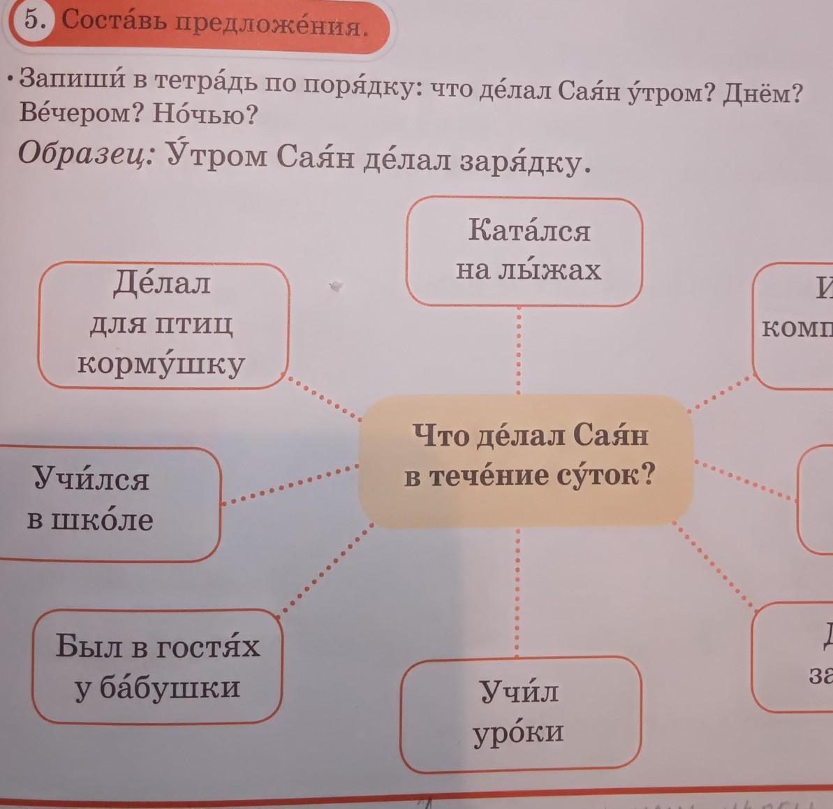 . Запиши в тетрадь по порядку: что делал Саян утром? Днём?