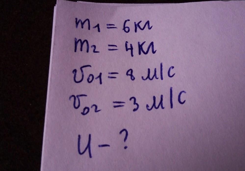 Два неупругих шара массами 12 кг и 8 кг движутся навстречу друг другу со скоростями 10 м/с и 5м/с соответственно, направленными вдоль одной прямой. С какой скоростью они будут двигаться после абсолютно неупругого соударения?
