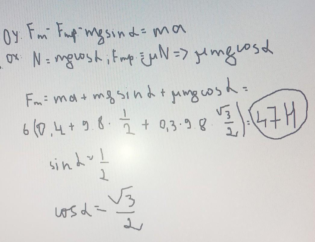 Какую силу необходимо приложить к телу массой 6 кг, чтобы оно перемещалось вверх по наклонной плоскости с ускорением 0,4 м/c²? Наклонная плоскость составляет с горизонтом угол 30, а коэффициент трения равен 0,3.