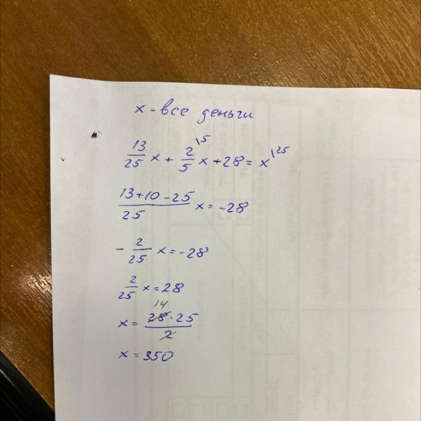 Егор потратил 13/25 своих денег на покупку книги, 2/5 своих денег на покупку конфет, после чего у него осталось 28 рублей. Сколько рублей было у Егора первоначально? ПОМОГИТЕ ПОЖАЛУЙСТА