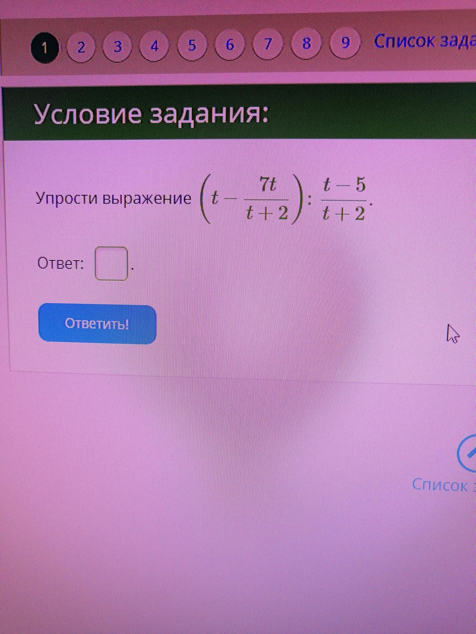 (t- 7t/t+2) : t-5/ t+2= t(t+2)-7t/ t+2 • t+2/ t-5= (t^2+ 2t- 7t) • 1/ t-5= (t^2- 5t) • 1/t-5= t(t-5) • 1/ t-5( сокращаем на t-5) = x