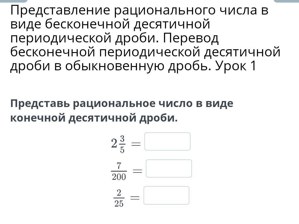 Представление рационального числа в виде бесконечной десятичной периодической дроби. Перевод бесконечной периодической десятичной дроби в обыкновенную дробь. Урок 1