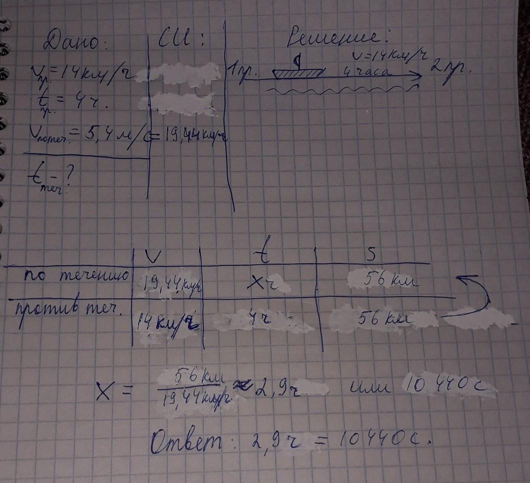 Пароход, двигаясь против течения со скоростью 14 км/ч, проходит расстояние между двумя пристанями за 4 ч. За какое время он пройдёт то же расстояние по течению, если скорость парохода по течению равна 5,4 м/с?