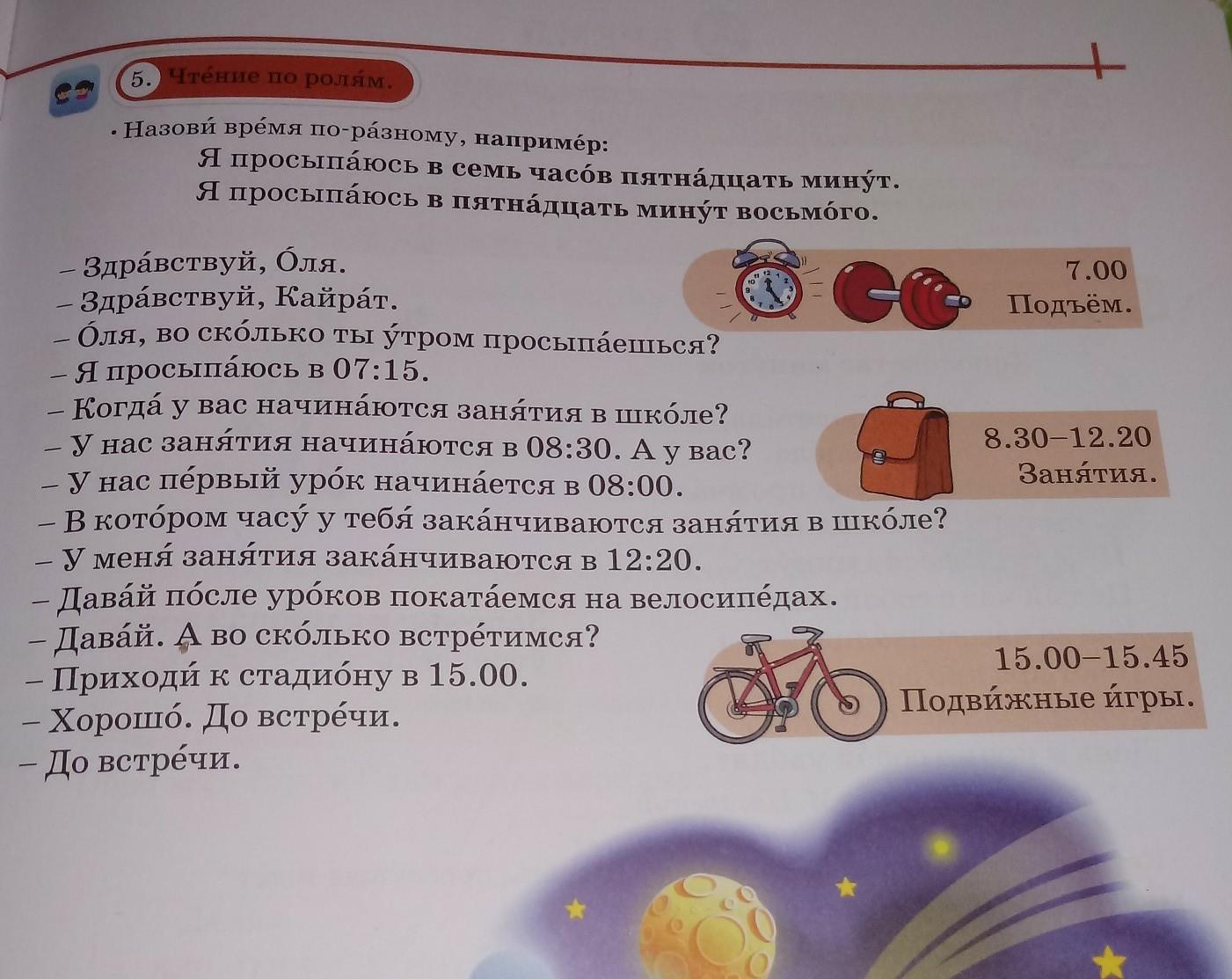 Значит занятия начинаются в восемь часов 30 минут_ пол восьмого. Первый урок начинается в 8 часов. Занятия заканчиваются в 12 часов 20 минут_ 20 минут двенадцатого. Приходи к стадиону