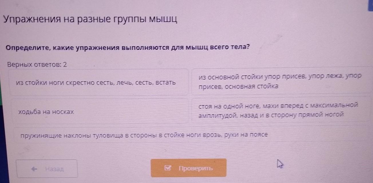 Ответ:Верных ответов: 2 из основной стойки упор присев, упор лежа, упор присев, основная стойка из стойки ноги скрестно сесть, лечь, сесть, встать ходьба на носках пружинящие наклоны туловища в стороны в стойке ноги врозь, руки на поясе стоя на одной ноге, махи вперед с максимальной амплитудой, назад и в сторону прямой ногой.