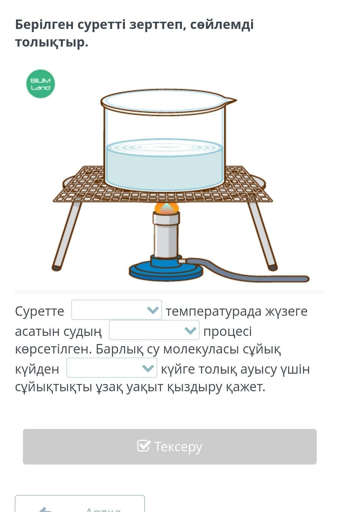 Суретте 100°C температурада жүзеге асатын судың қайнау процесі көрсетілген су молекуласы сұйық күйден газтəрізді күйге толық ауысу сұйықты ұзақ уақыт қыздыру қажет