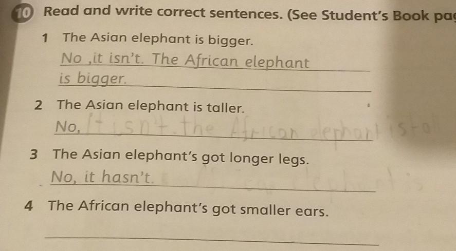 10) read and write correct sentences. (see student's book page 28.) 1 the asian elephant is bigger. no it isn't. the african elephant is bigger 2 the asian elephant is taller. no. 3 the asian elephant's got longer legs. 4 the african elephant's got smaller ears