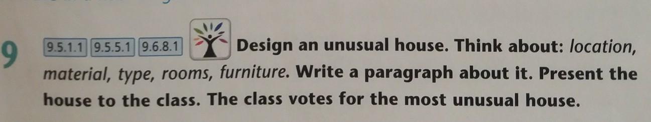 Design an unusual house. Thin about: location, material, type, rooms, furniture. Write a paragraph aboute it. Present the house to the class. The class votes for the most unusual house.