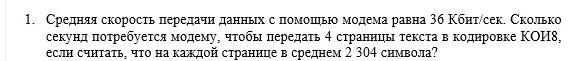 V = Вес символа * количество символов * количество страниц = 8 * 2304 * 4 = 73728 бит = (73728 / 1024) Кбит = 72 Кбит