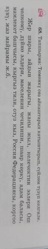 жер шаары чон, айдын жарыгы ак тусто, жаны жыл бир жылда бир келет,дуйно элдери коп,маселенин чечилиши кыйын, шаар корку кооз, адам баласы эн акылдуу,кыргыз тили биздин тилибиз, отуз кыз болуп илгерки оюндарды ойношту, Россия Федерациясы эн чон мамлекет, коргоо куну бул бизге аябай сылык куну, жаз майрамы бул нооруз.