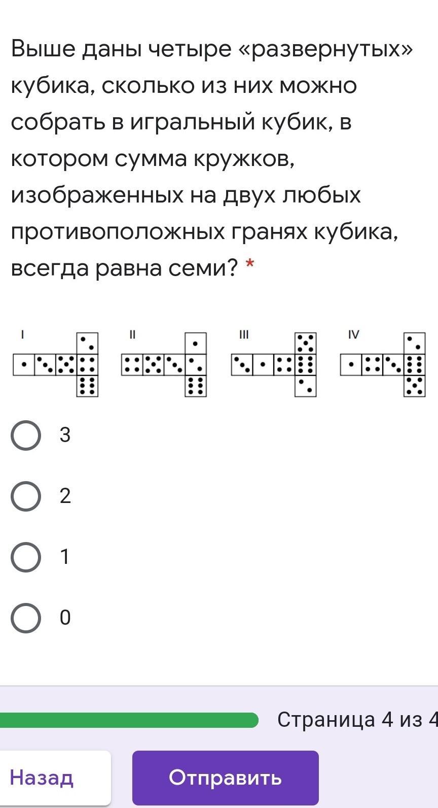 Выше даны четыре «развернутых» кубика, сколько из них можно собрать в игральный кубик, в котором сумма кружков, изображенных на двух любых противоположных гранях кубика, всегда равна семи? *