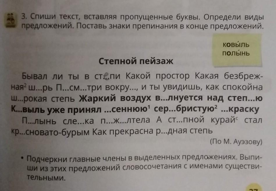 Бывал ли ты в степи? Какой простор! Какая безбрежная ширь! Посмотри вокруг, и ты увидишь, как спокойна широкая степь. Жаркий воздух волнуется на степью. Ковыль уже принял осеннюю серебристую краску. Полынь слегка пожелтела. А степной курай стал красновато-бурым. Как прекрасна родная степь!