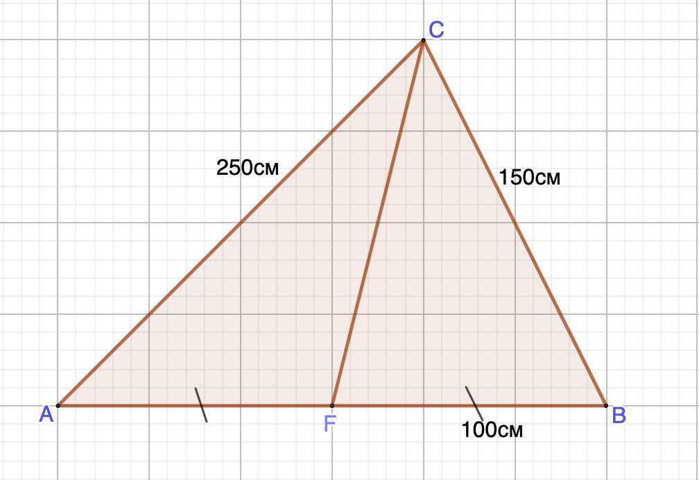 Вычисли периметр треугольника ACB, если CF — медиана, и известно, что AC=250см,BC=150см и FB=100см.