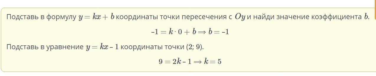 График функции y = kx + b проходит через точку (2; 9) и пересекает ось Oy в точке с координатами (0; –1). Найди значения коэффициентов k и b.