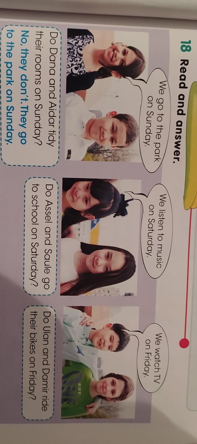 2.Do Assel and Saule go to school on Saturday?No,they don't.They listen to music on Saturday.3.Do Ulan and Damir ride their bikes on Friday?No,they dont.They watch TV on Friday.