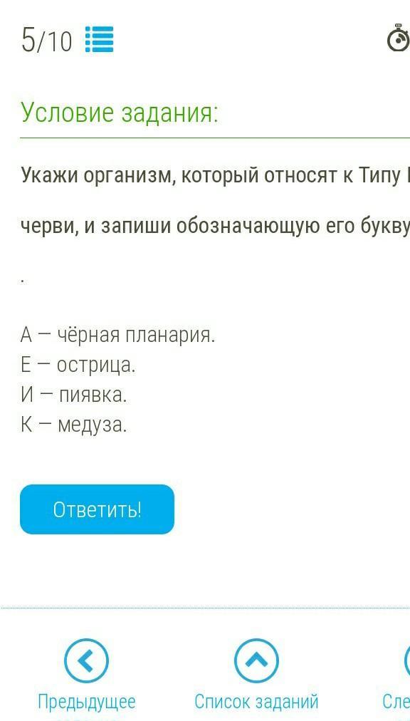 Укажи организм, который относят к Типу Плоские черви, и запиши обозначающую его букву: