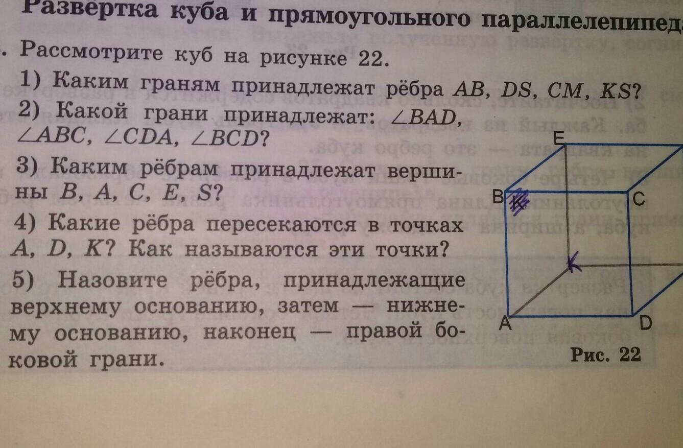 1)AB - ABCD и EBAK, DS не видно (правая и нижняя грань), CM тоже не видно (верхняя и правая), KS - нижняя и задняя походу. Потом просто буквы подставь, а то на фотке не видно.