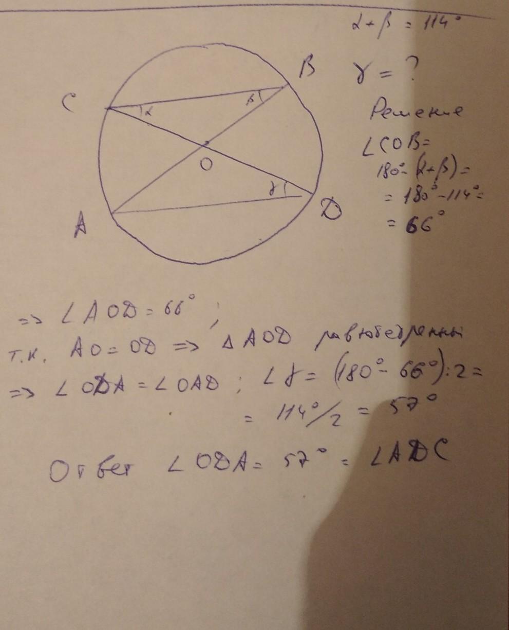 AB и CD - диаметры одной окружности с центром в точке O. Сумма углов OCB и OBC равна 114°. Найдите угол ADC.
