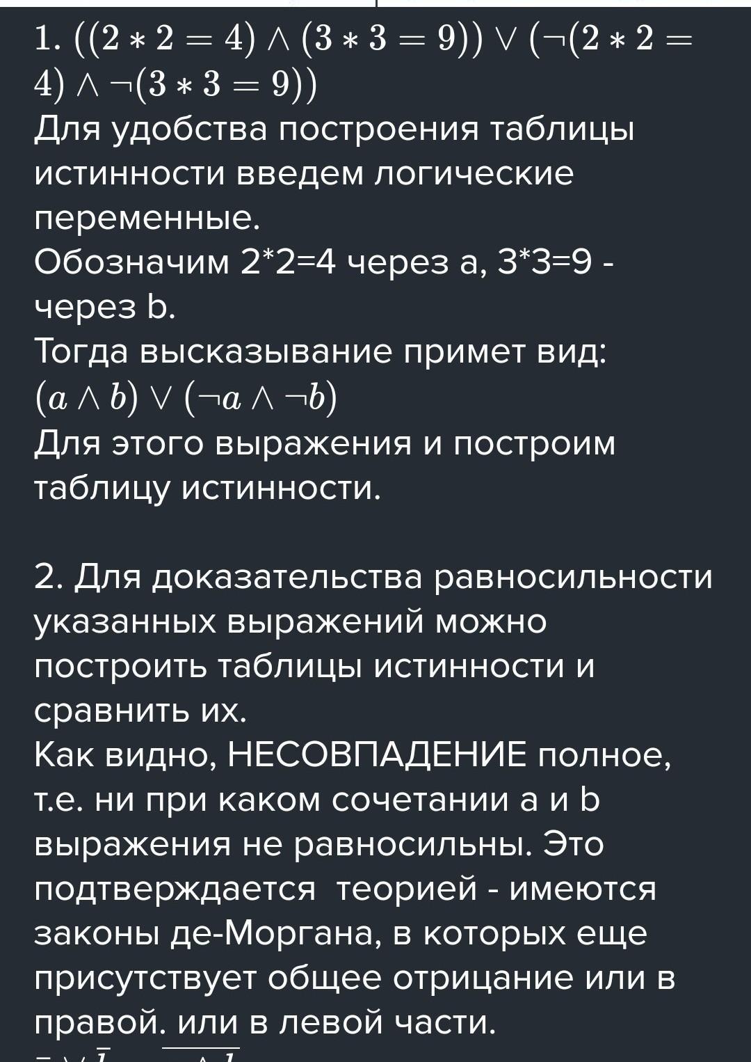 Записать составное высказывание «(2*2=4 и 3*3=9) или (2*2≠4 и 3*3≠9)» в форме логического выражения. Построить таблицу истинности.