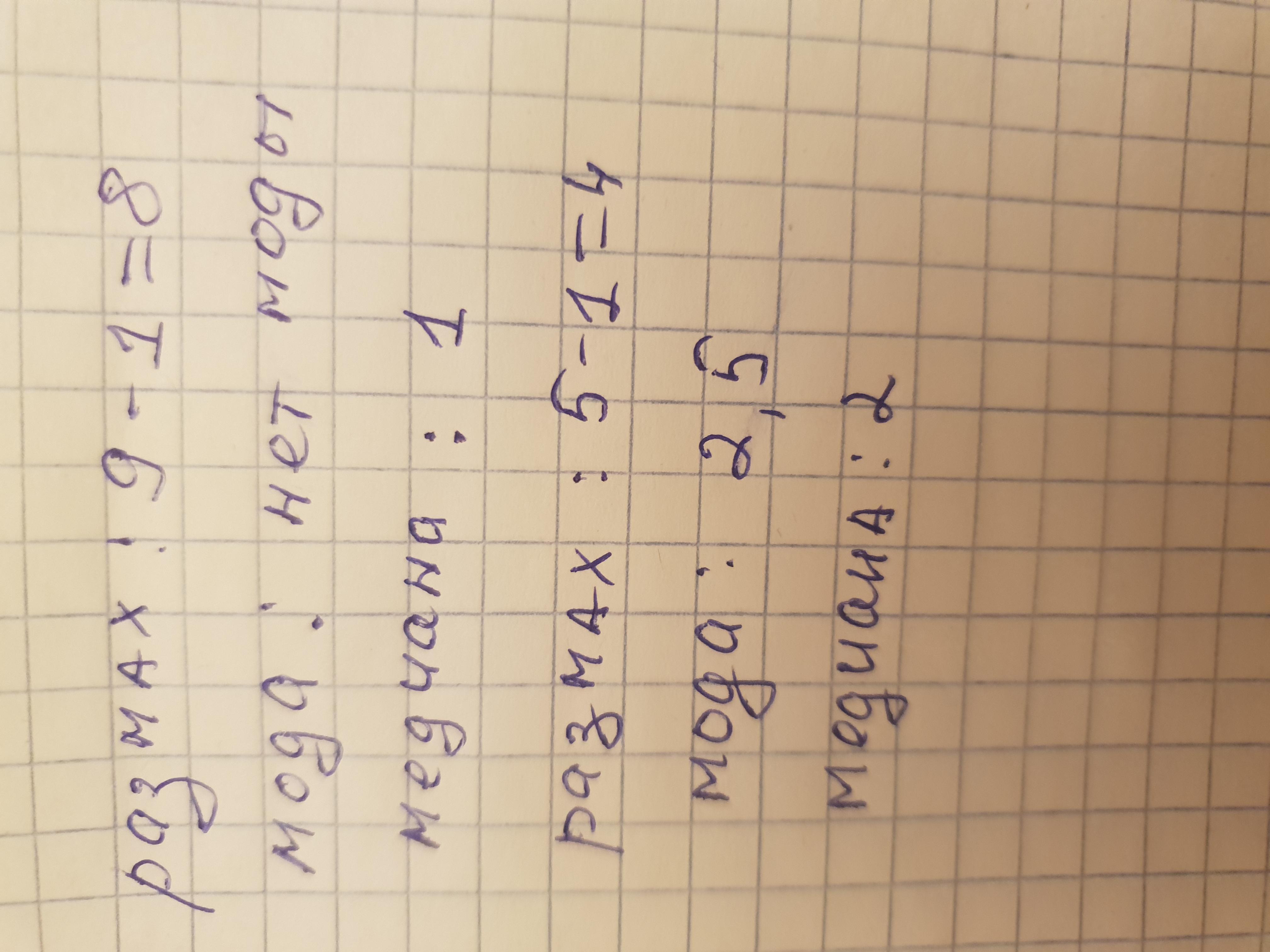 1) Дан ряд чисел: 3, 5, 1, 7, 9. Найти размах, моду и медиану.