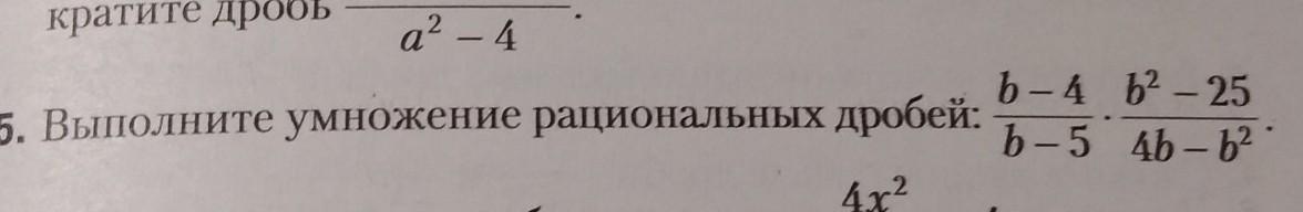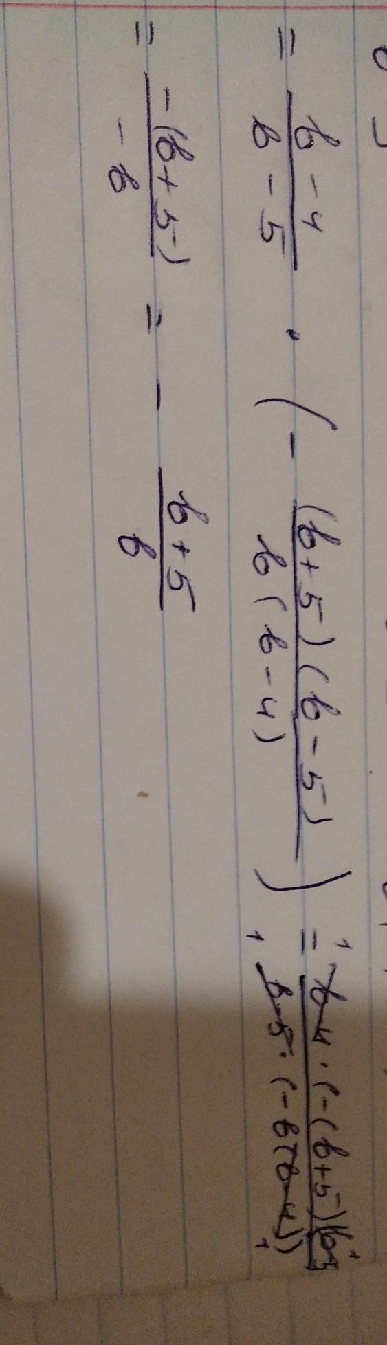 на другій строчці останнє, напевне, погано видно. тому ось: чисельник (те, що вгорі) — в-4 (закреслено) ×(-(в+5)(в-5)) (в-5 — закреслено); знаменник — в-5 (закреслено) × (-в(в-4)) (в-4 — закреслено).