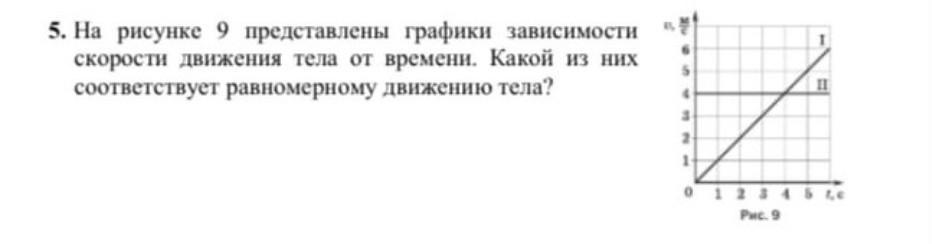 График 2, так как не наблюдается зависимости между скоростью(изменением скорости) и временем. То есть, скорость постоянна. Первый график характерен для равноускоренного движения.