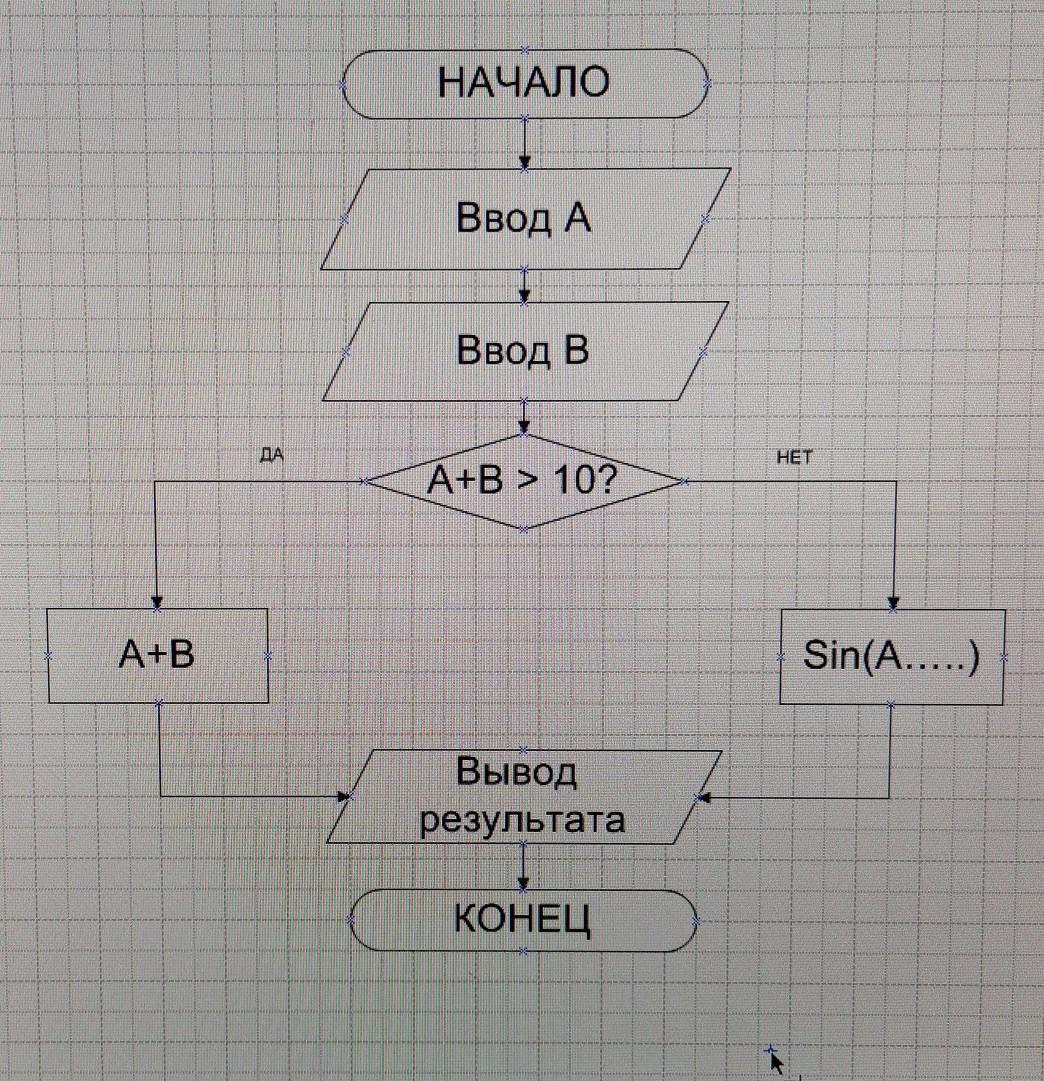 Даны два числа A и B. Если A+B>10 вычислить A+B, если нет вычислить sin(A\u001eB). Полученные результаты вывести