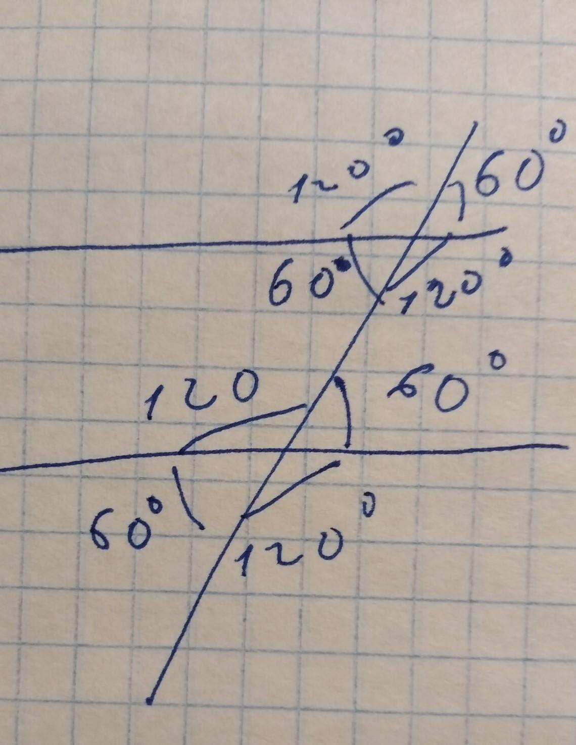 Срочно дали таке з геометрії таке:при перетині двох прямих січною один з внутрішніх одинакових кутів =60° знайти всі кути пж поможіть