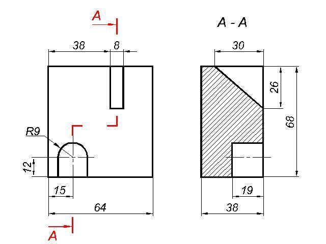 На втором чертеже красным цветов выделила направление взгляда (стрелки) и по каким линиям выполнен разрез.