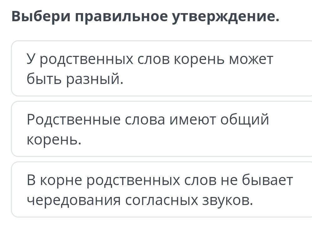 выбери правильное утверждение. У родственных слов корень может быть разный. 2) родственные слова имеют общий корень 3) в корне родственных слов не бывает чередования согласных звуков