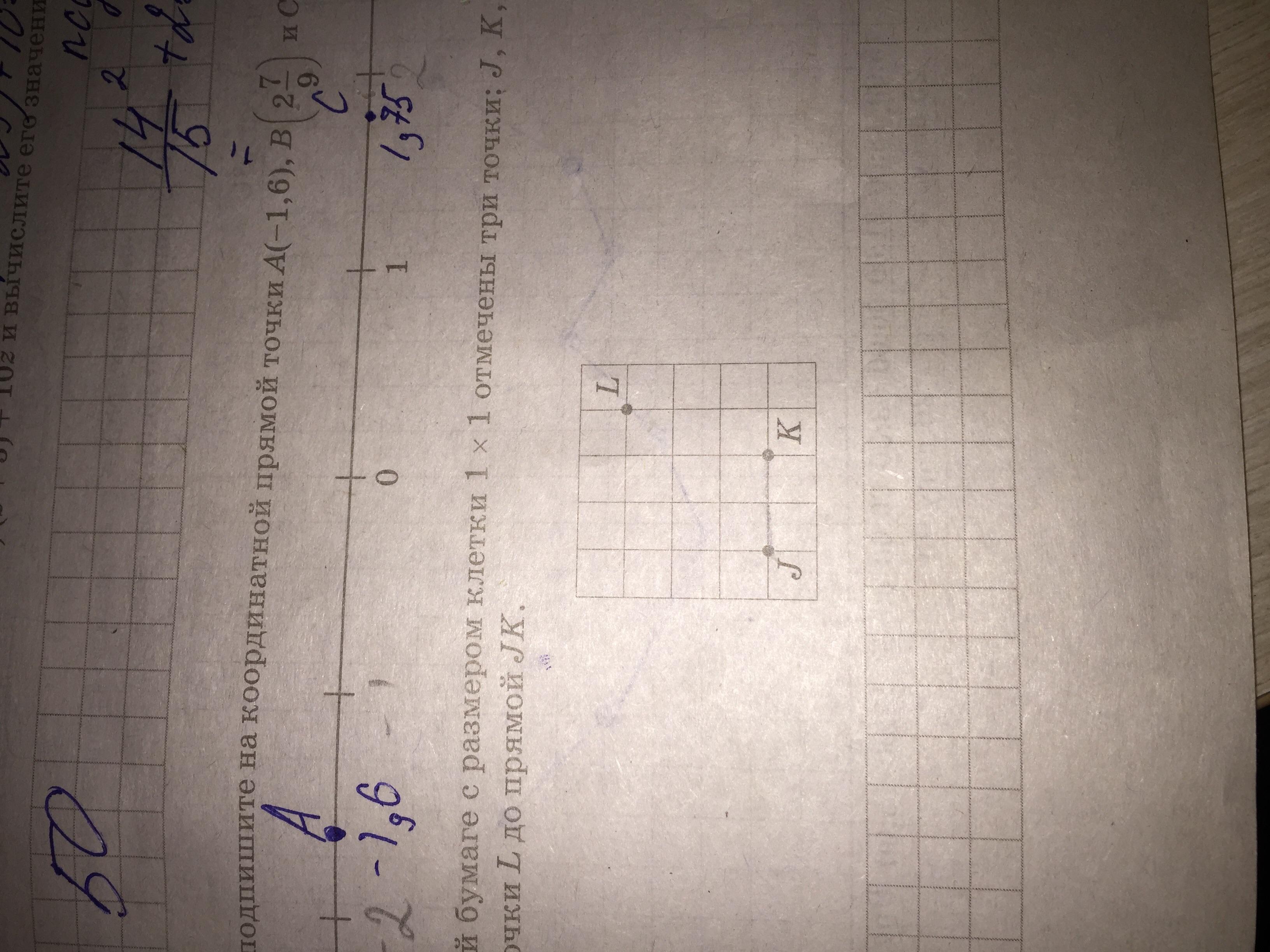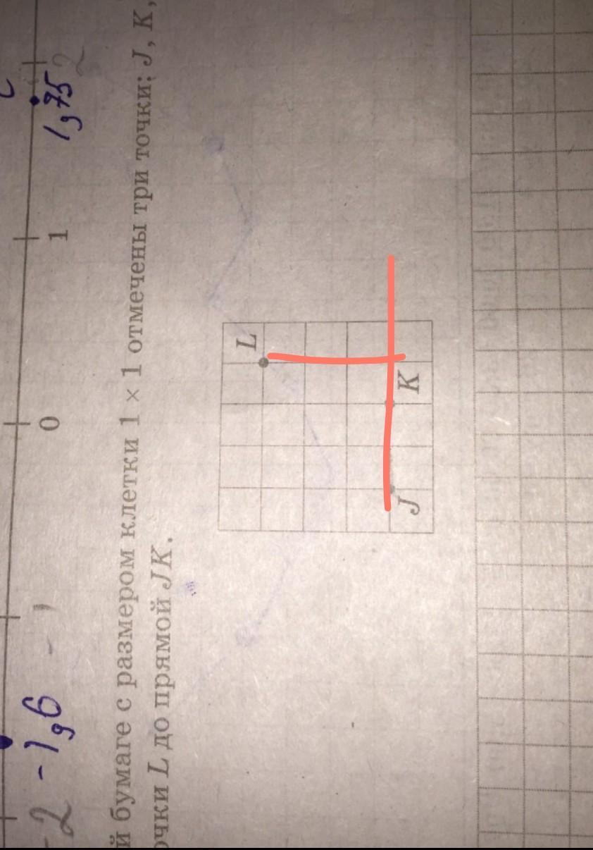на клечатой бумаге с размером клетки 1x1 отмечаемы три точки J K L. Найдите расстояние от точки L до прямой JK