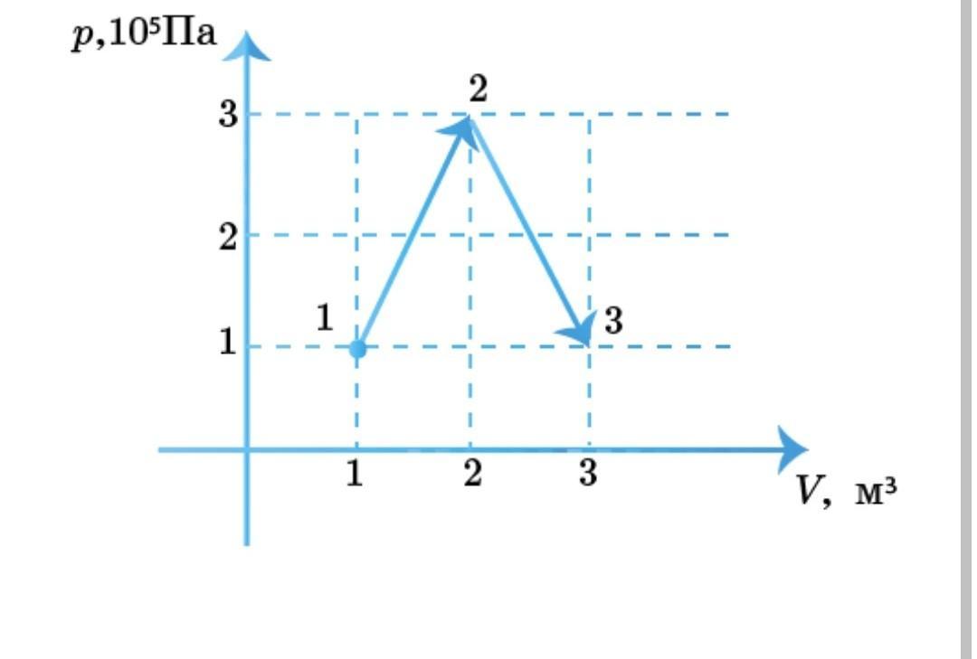 Газ медленно переходил из состояния 1 в состояние 3. Весь процесс 1–2–3 показан на графике p(V). Определи, какую работу совершает газ, когда он переходит из состояния 1 в состояние 3.