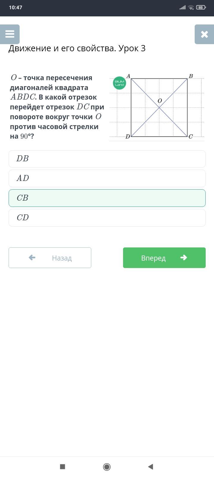 O - точка пересечения диагоналей квадрата ABCD. В какой сегмент перемещается сегмент постоянного тока, когда он вращается против часовой стрелки на угол 90 ° около точки O?