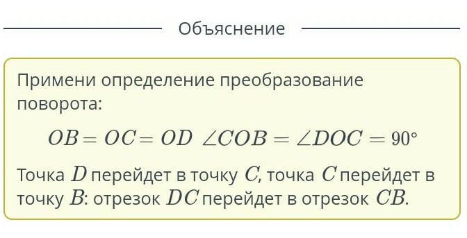 O – точка пересечения диагоналей квадрата ABDC. В какой отрезок перейдет отрезок DC при повороте вокруг точки O против часовой стрелки на 90°?