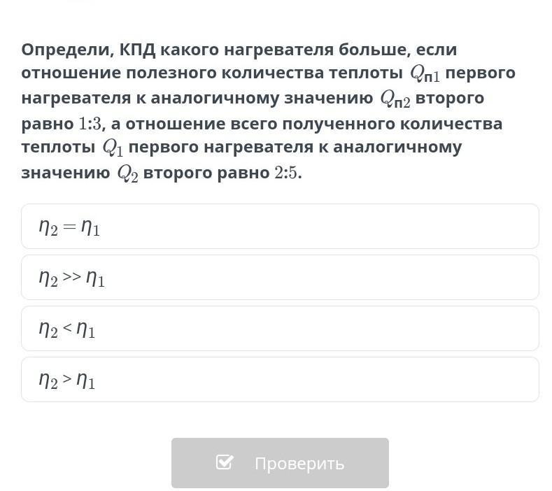Определи, КПД какого нагревателя больше, если отношение полезного количества теплоты Qп1 первого нагревателя к аналогичному значению Qп2 второго равно 1:3, а отношение всего полученного количества теплоты Q1 первого нагревателя к аналогичному значению Q2 второго равно 2:5.