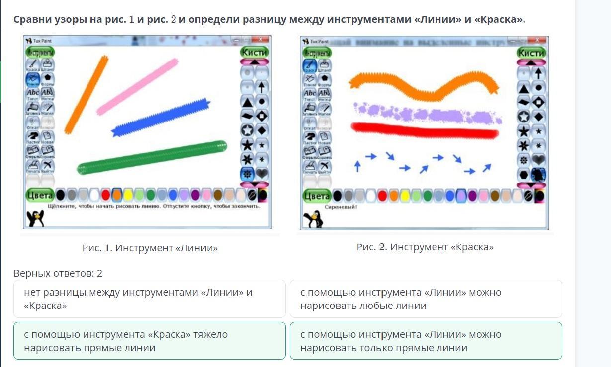 Сравни узоры на рис. 1 и рис. 2 и определи разницу между инструментами «Линии» и «Краска».