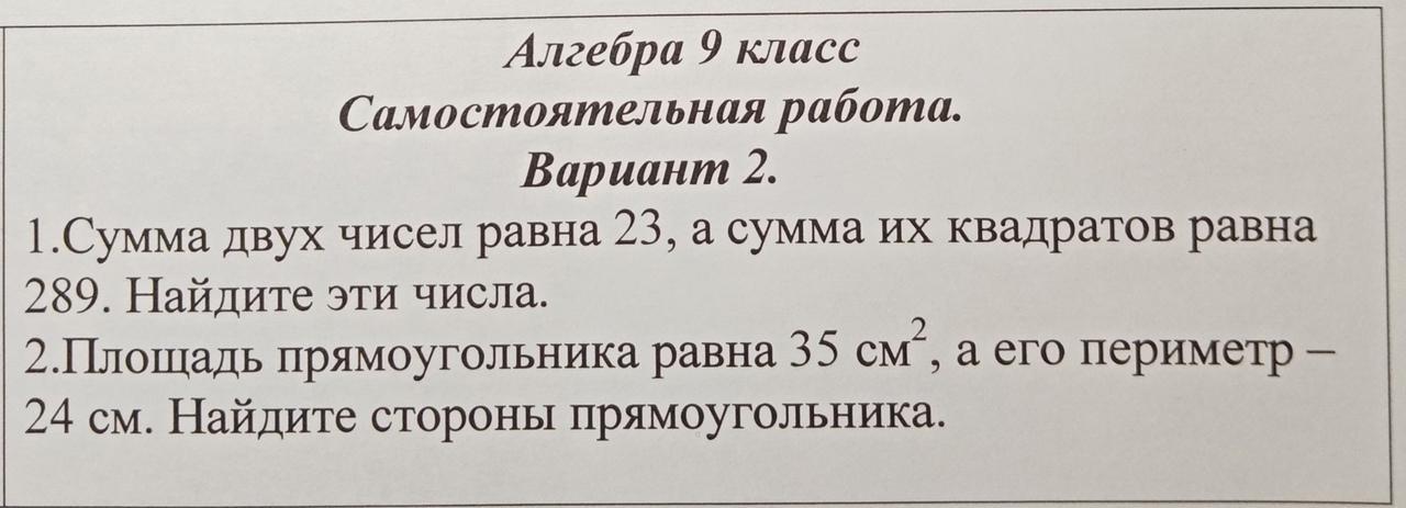 сумма двух чисел равна 23 а сумма их квадратов "289" найдите эти числа дайте полное решение пж