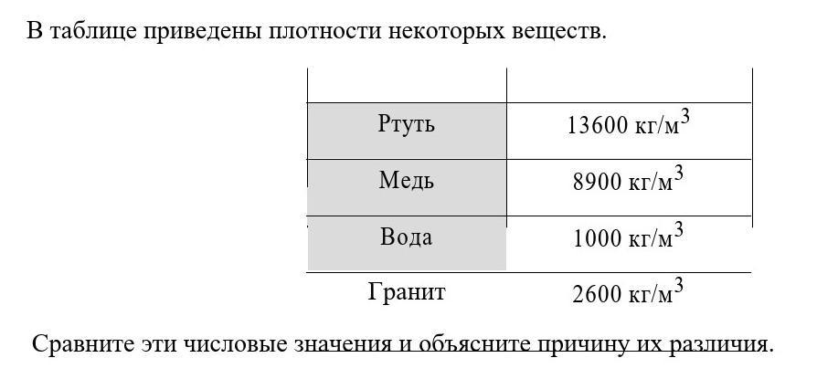 значит в одной единице объема 13600 кг ртути, 8900 кг меди, 1000 кг воды, 2600 кг гранита