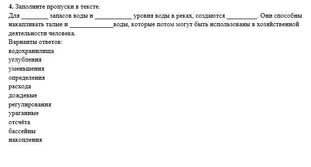Для накопления запасов воды и регулирования уровня воды в реках, создаются водохранилище. Они способны накапливать талые и дождевые воды,которые потом могут быть использованы в хозяйственной деятельности человека.