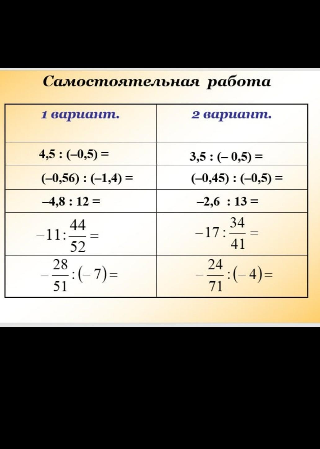 самостоятельная работа 1вариант. 4,5:(-0,5)= вариант 2 помагите пожалуйста умоляю вас